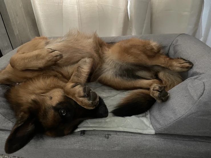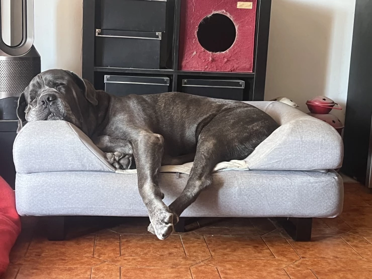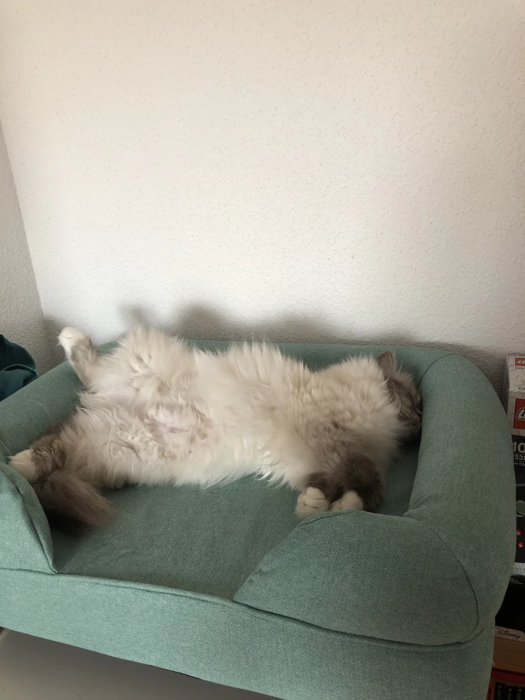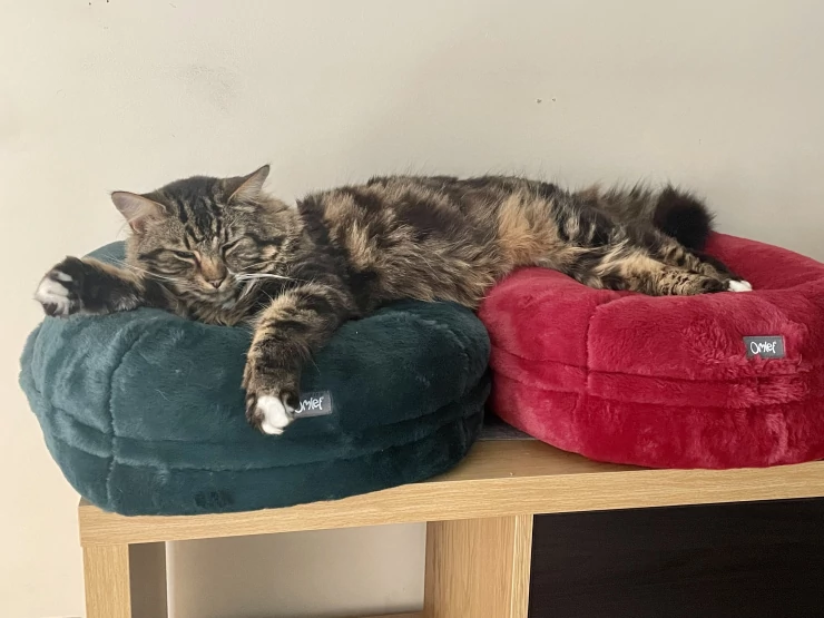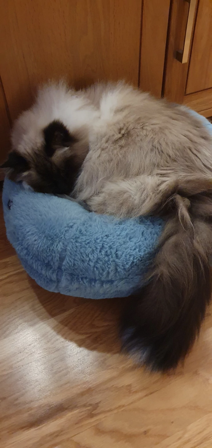 Caption: Coccole Luxuriating over 2 beds! (he does fit on one)