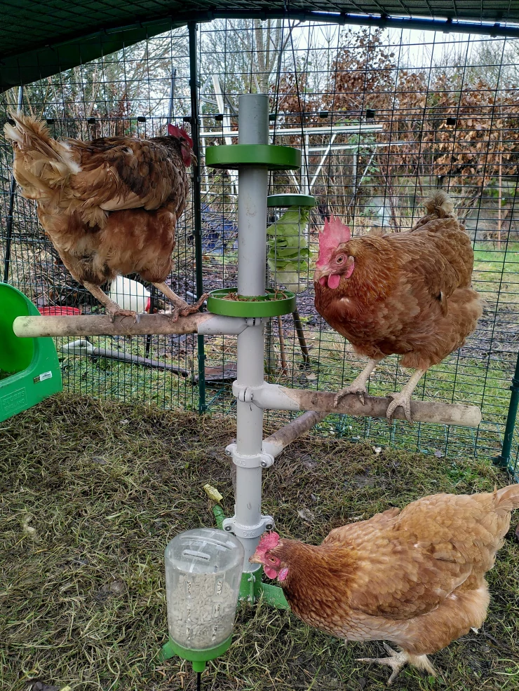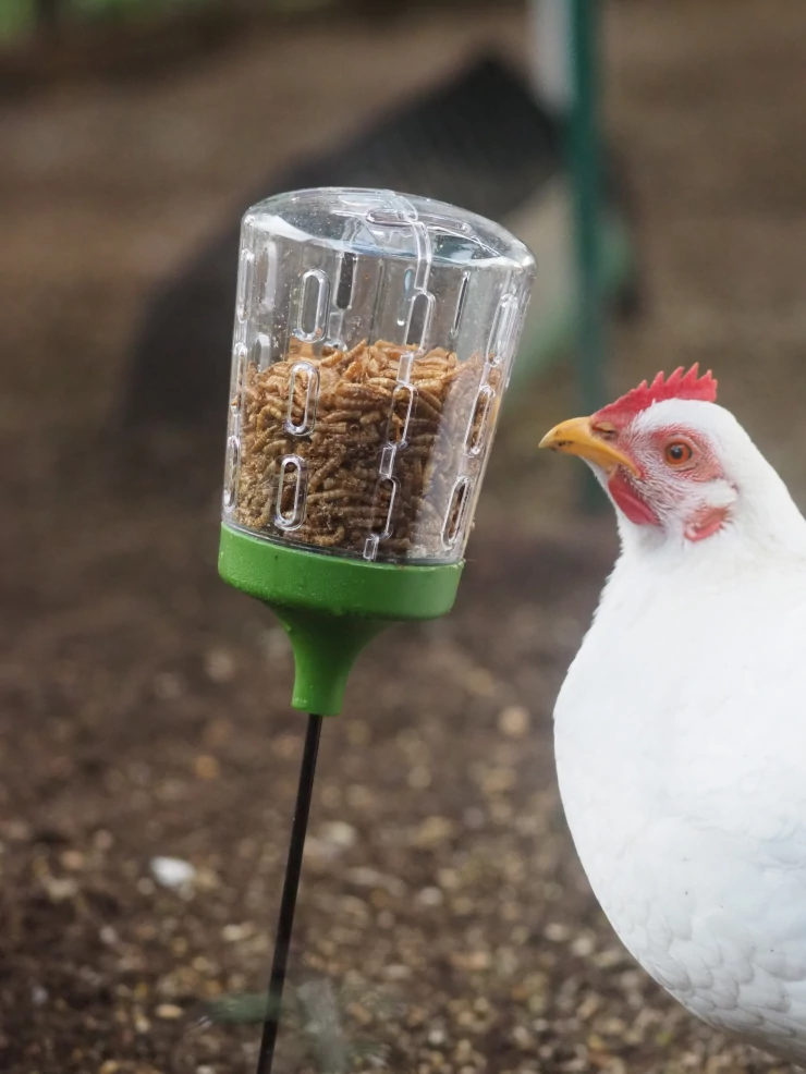 Caption: Maja ha imparato a usare il suo giocattolo per beccare. le galline lo adorano.