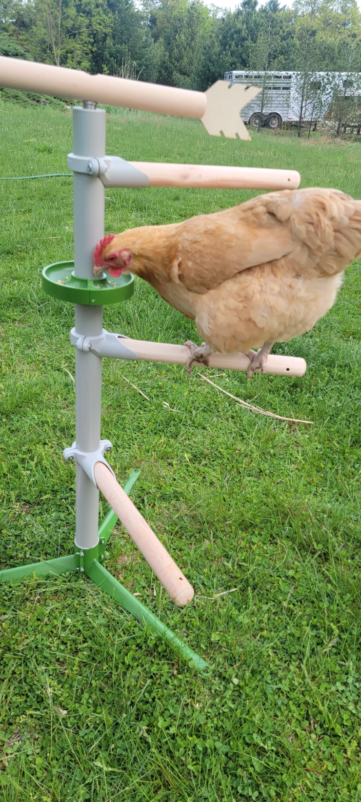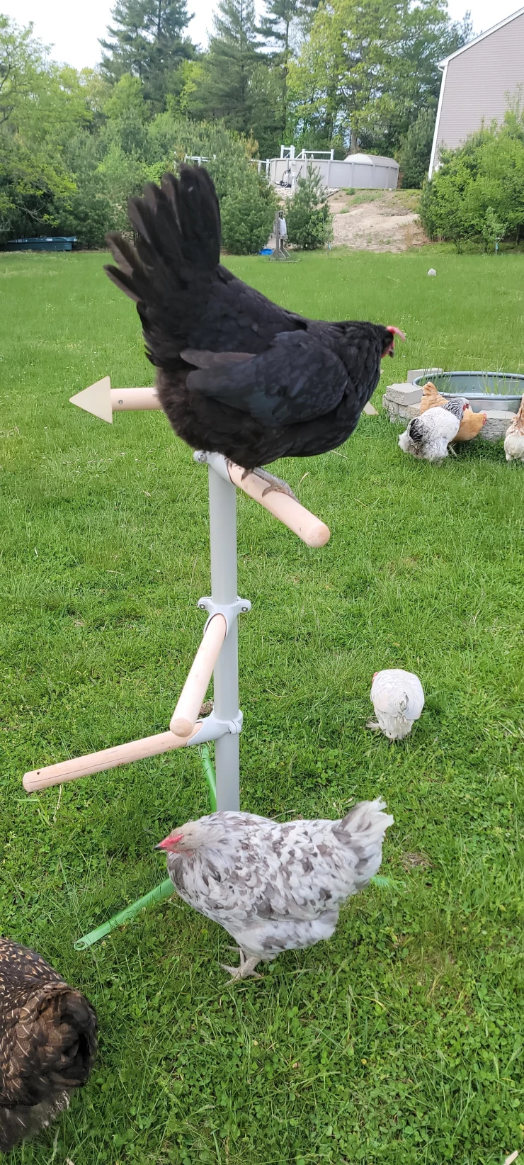 Caption: L'albero per appollaiarsi per i polli è incredibile. facile da assemblare, grande attaccamento stabile al terreno fornito. il piatto per le prelibatezze è spostabile e sicuro, il che fornisce intrattenimento per il gregge. la banderuola si muove e pu