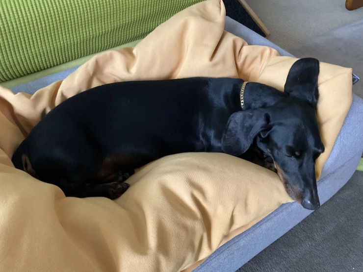 Caption: La mamma dice che questo non è il modo di usare il mio nuovo piano del sacco a pelo, ma io dico che mi piace così, firmato buddy dackel-blakey